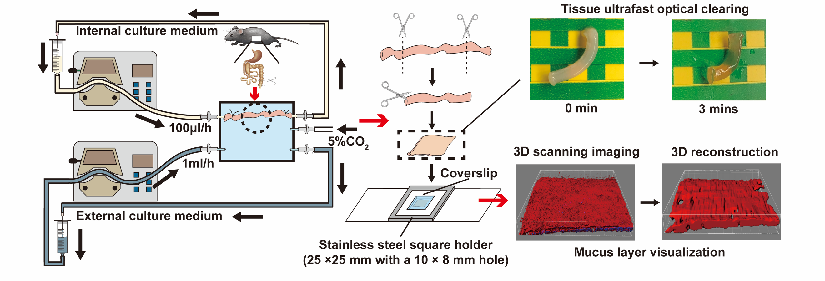 肠道组织是体内重要的“免疫-代谢-菌群”交互调控器官,其稳态的维持对于肠道生理功能的发挥并抵抗病原微生物的侵入至关重要。肠道上皮细胞中的杯状细胞(goblet cell)通过分泌粘液蛋白(mucin)形成贴附在上皮层面上的粘液层(mucus layer)进而隔离并控制肠道微生物的定殖和侵入,在肠道免疫中发挥关键性作用。然而目前对于肠道杯状细胞如何分泌粘液蛋白并维持粘液层的形成及其关键控制分子仍不明确。