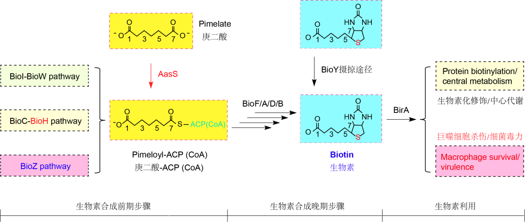 Biotin is an essential micro-nutrient across the three domains of life. The paradigm earlier step of biotin synthesis denotes “BioC-BioH” pathway in Escherichia coli. Here we report that BioZ bypasses the canonical route to begin biotin synthesis. In addition to its origin of Rhizobiales, protein phylogeny infers that BioZ is domesticated to gain an atypical role of β-ketoacyl-ACP synthase III. Genetic and biochemical characterization demonstrates that BioZ catalyzes the condensation of glutaryl-CoA (or ACP) with malonyl-ACP to give 5’-keto-pimeloyl ACP. This intermediate proceeds via type II fatty acid synthesis (FAS II) pathway, to initiate the formation of pimeloyl-ACP, a precursor of biotin synthesis. To further explore molecular basis of BioZ activity, we determine the crystal structure of Agrobacterium tumefaciens BioZ at 1.99 Å, of which the catalytic triad and the substrate-loading tunnel are functionally defined. In particular, we localize that three residues (S84, R147, and S287) at the distant bottom of the tunnel might neutralize the charge of free C-carboxyl group of the primer glutaryl-CoA. Taken together, this study provides molecular insights into the BioZ biotin synthesis pathway.